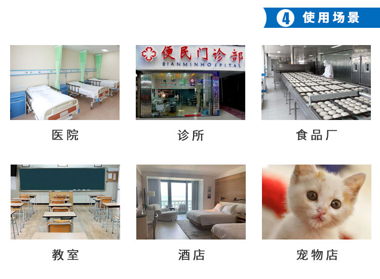 用于醫(yī)療機(jī)構(gòu)(手術(shù)室、治療室、供應(yīng)室、制劑室、病房)、需要消毒的公共場(chǎng)所、學(xué)校、有衛(wèi)生要求的生產(chǎn)車間、家庭居室等,進(jìn)行室內(nèi)空氣消毒